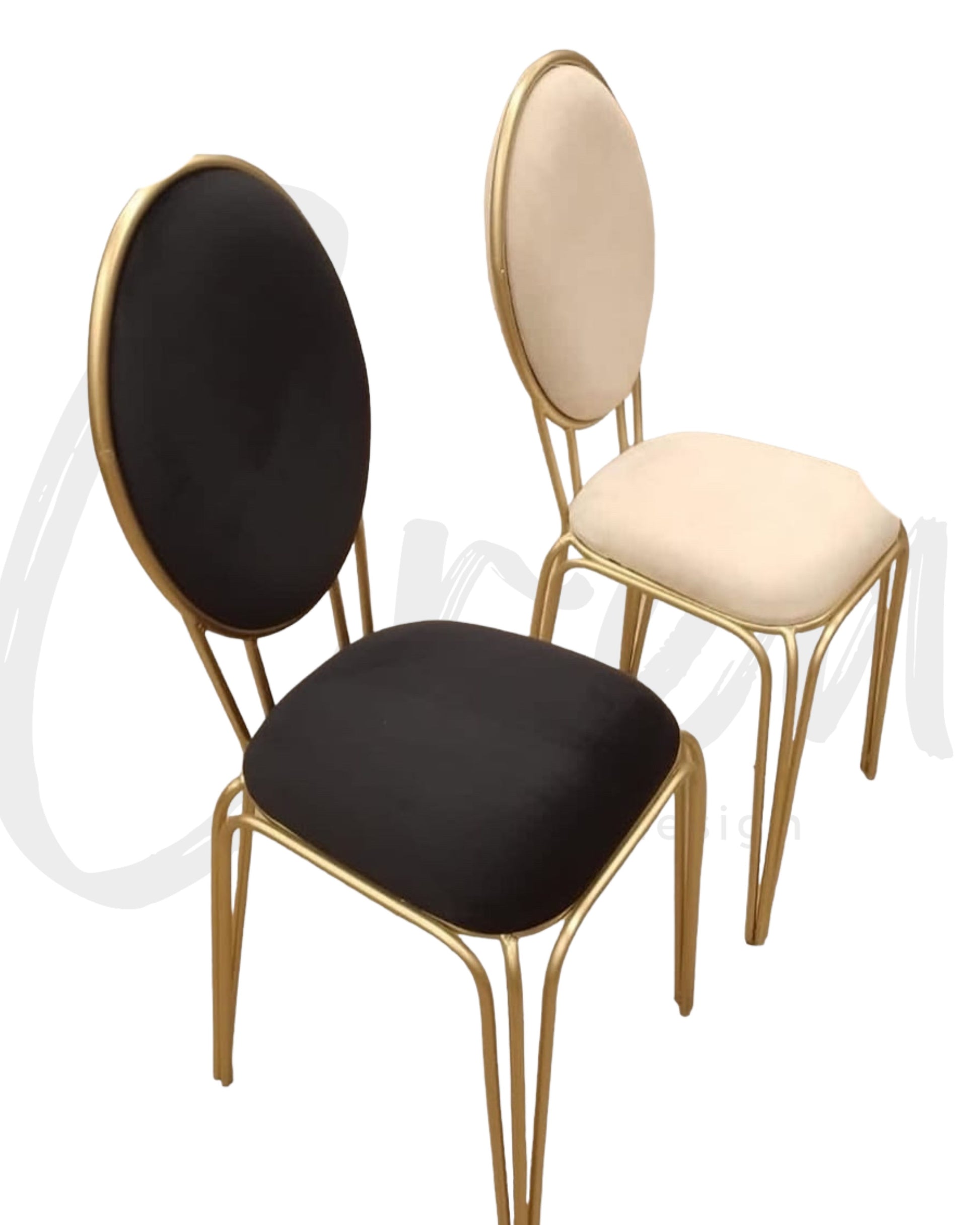 a Silla Victoria es un ícono de elegancia contemporánea. Su respaldo ovalado y tapizado, combinado con una estructura metálica en acabado dorado, le otorgan una estética glam sin perder ligereza visual. Ideal para ambientes refinados, como comedores sofisticados, espacios de eventos o rincones de hotelería boutique que buscan impacto visual sin excesos.